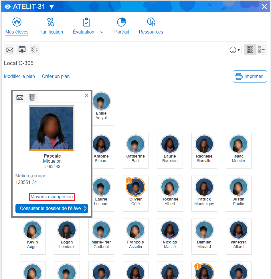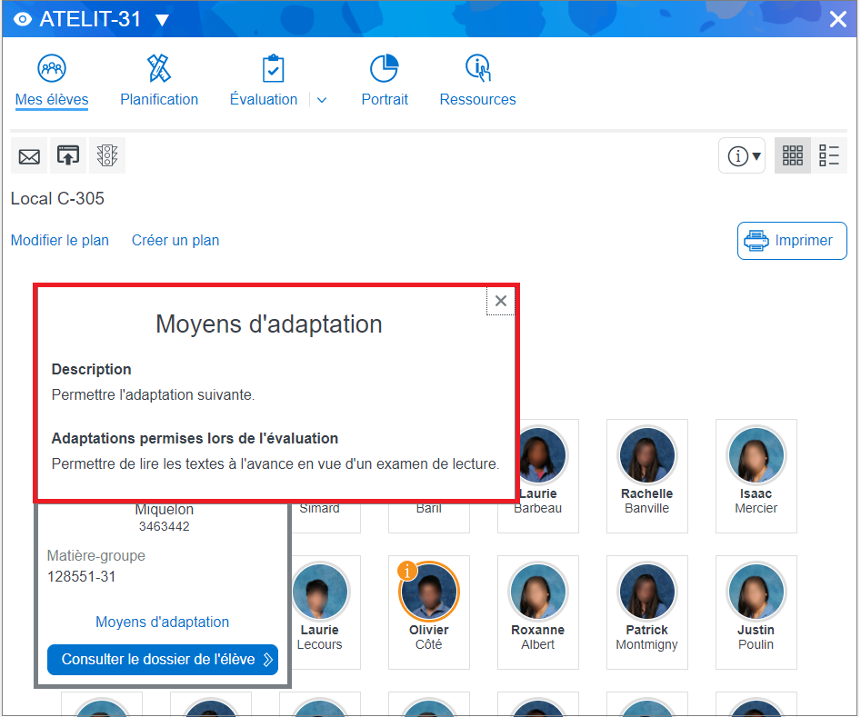 5. Consultez les moyens d’adaptation disponibles pour l’élève sélectionné.