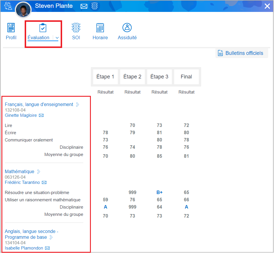 Comme enseignant d’un élève, il vous est possible de voir les résultats des autres matières dans le dossier d’un élève, sous l’onglet « Évaluation ».