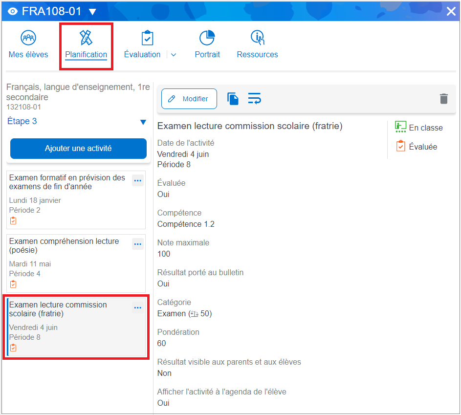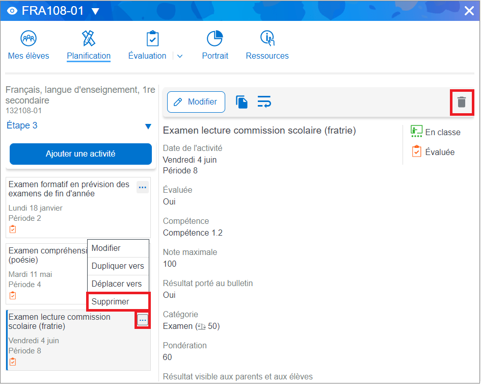 Il n’est pas possible de supprimer une activité à partir de l’onglet «Évaluation».